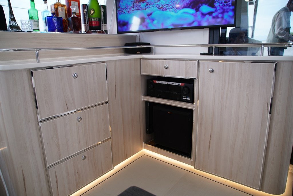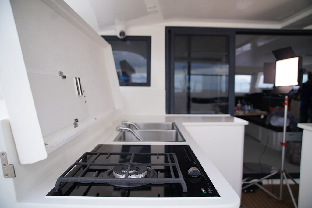 Modern Galley: Fully equipped for onboard dining and social gatherings, with ample storage and workspace
